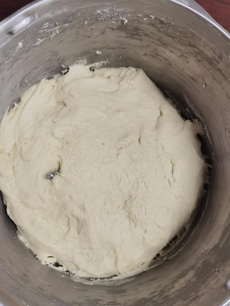室温22°C,约3~4小时,二次醒发至2倍大,开启和面程序10分钟,视情况分次筛入少量干面粉,和面结束,案板筛少量干面粉,整理,成形,圆形,刀切,看自己喜好。
