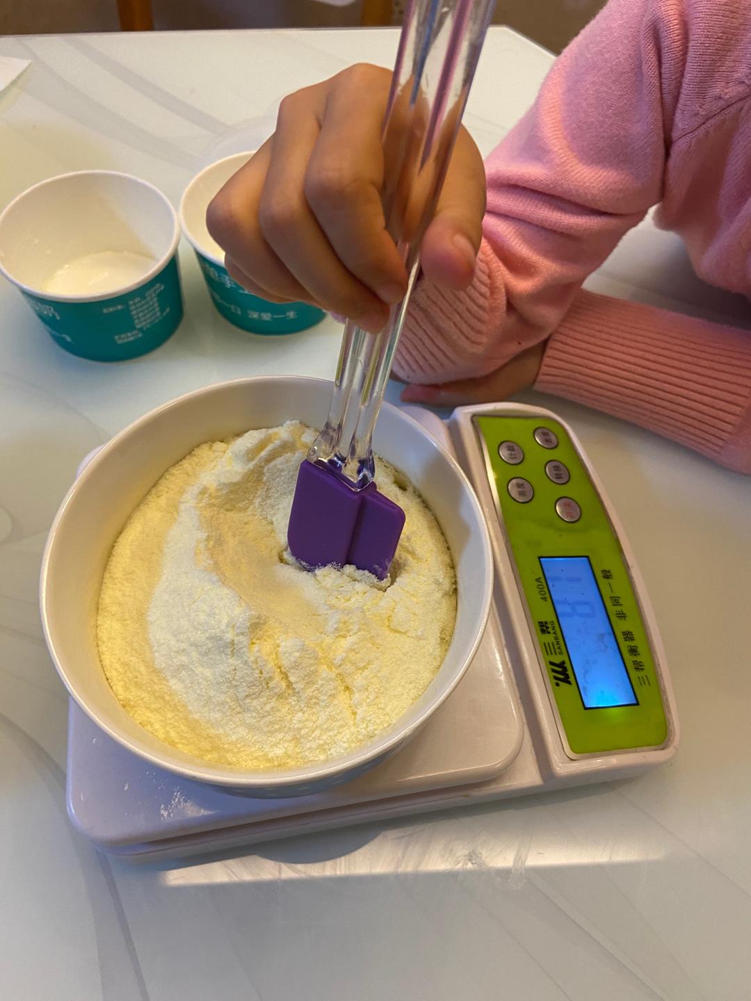 再搅拌均匀,就可以装进容器里了。这是今晚带宝宝做的,直接装酸奶盒里了。