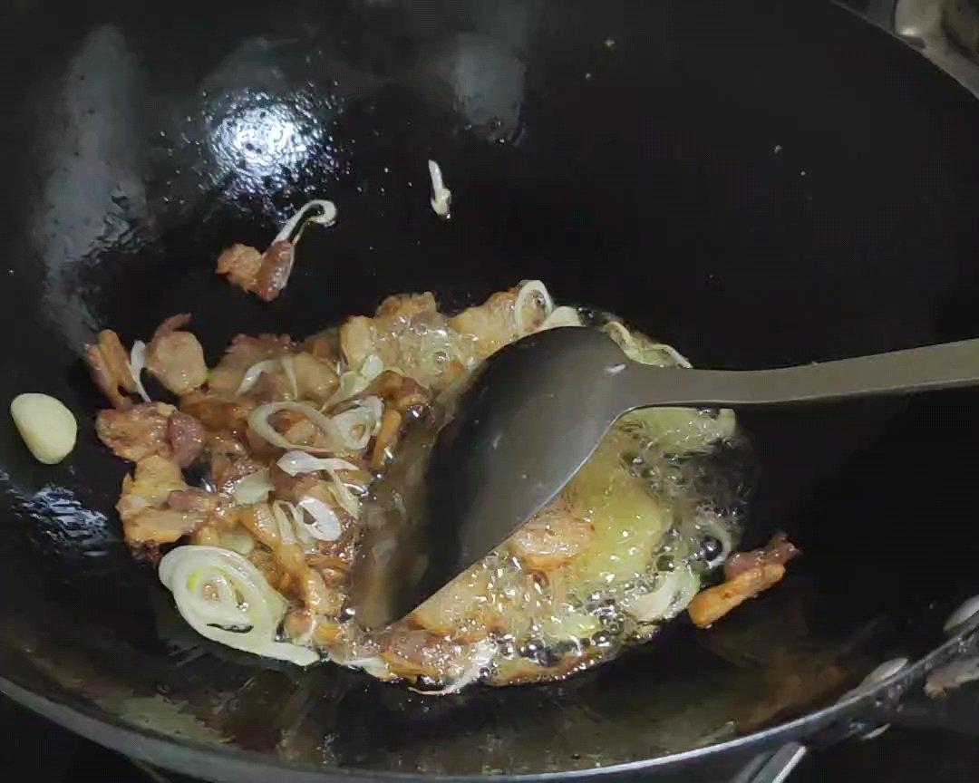 锅里的油明显增多就是肥油都炒出来了,肉微微焦黄,此刻加葱姜蒜