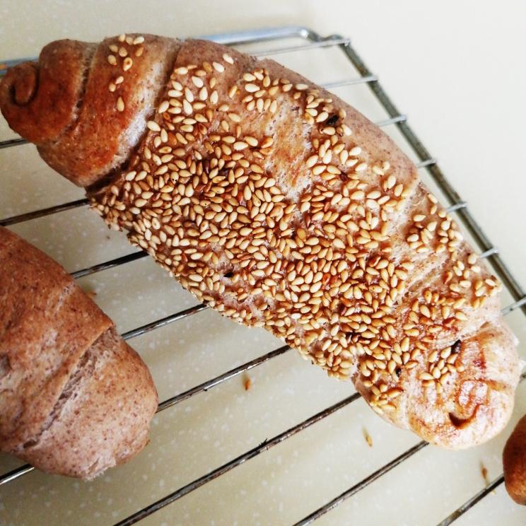 三角形底边卷入一条黄油, 三角形两腰涂抹软化或融化黄油(以便卷起烘烤时分层), 向三角形顶点匀力卷起,收口向下, 底部喷水沾白芝麻,顶部也可沾少许,依次放入烤盘,放温暖湿润处二次发酵约40~60min。