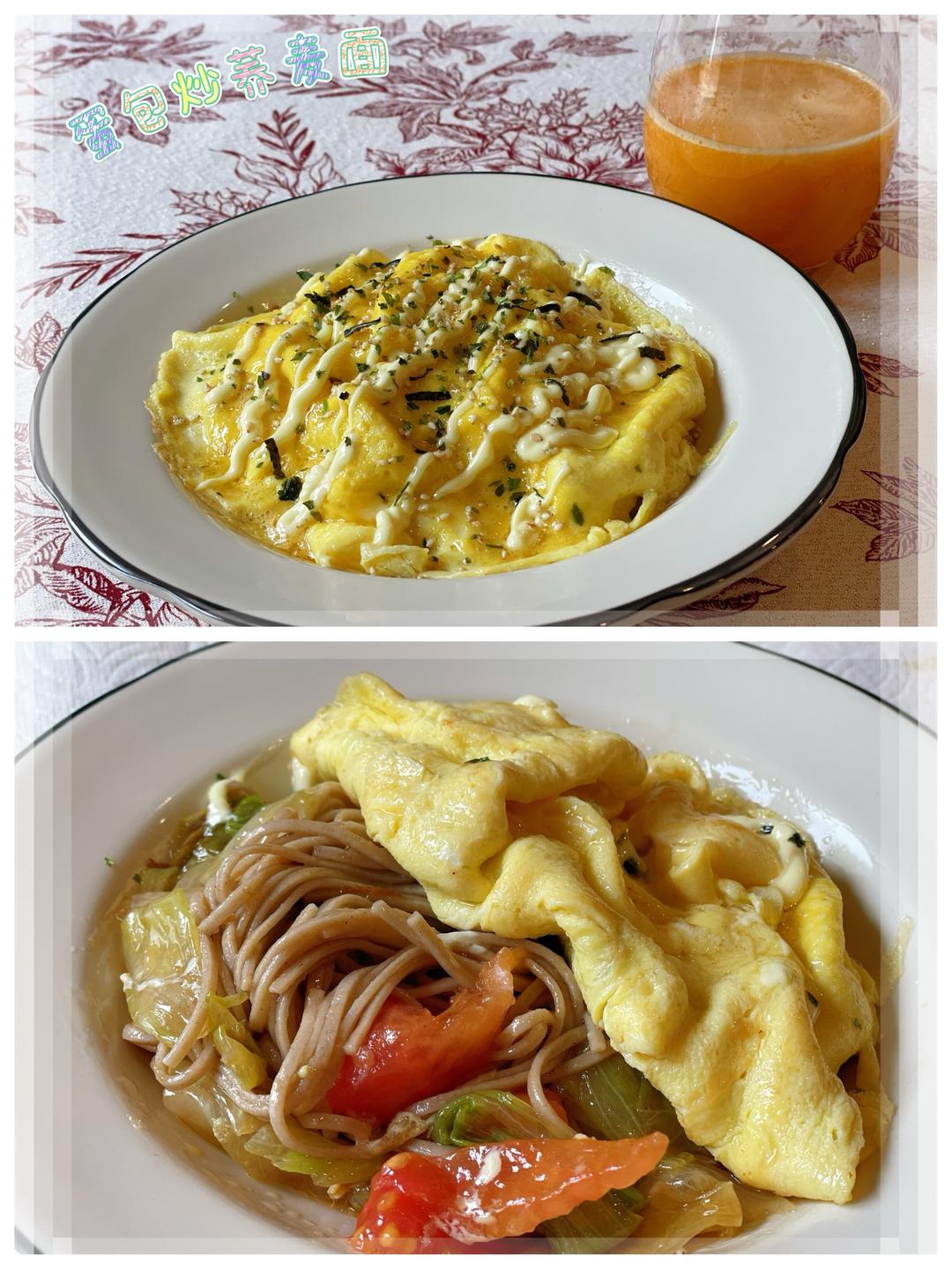🔺第412道→ 蛋包炒荞麦面 沸水锅煮荞麦面,煮好沥水。 番茄半个去皮切小块,包心菜或生菜洗净切块,鸡蛋2个加盐打散。 热锅热油,放入番茄和蔬菜炒至断生,加盐/糖调味,放入煮好的荞麦面,加少许酱油或烧肉汁翻炒均匀,装盘。 热锅热油,倒入打散的蛋液,轻轻画圈划散,见底部开始凝固了就保持不动,表层蛋液大概8成熟时出锅,盖在炒面上。 挤上美乃滋,撒海苔碎。 橙汁2个+胡萝卜+西芹,打成汁。
