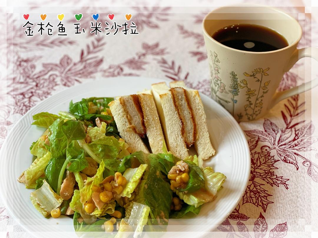 🔺第413道→ 金枪鱼玉米沙拉 生菜+罗勒+金枪鱼罐头+玉米粒,淋上自己喜欢的沙拉酱搅拌均匀。 〔炸猪排吐司〕是昨日晚餐剩的,非常好吃,改天重新做了当早餐。 吐司2片,炸猪排一片,咖喱酱适量。 炸锅加热至油温5成热,放入猪排炸至两面泛白取出,升高油温至7成,放入猪排复炸至两面金黄,取出控油。 热锅,放入咖喱酱加热至浓稠,放入炸猪排两面均匀蘸取,放进2片吐司当中略微按压,对角切开呈三角形。 黑咖啡一杯。 ⭐️ 咖喱酱是前两日的咖喱鸡剩食,放入料理机中打碎成泥,冻起来,用时取出加热,再加入适量酱油调味。