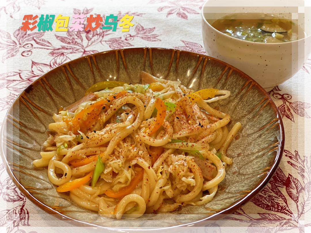 🔺第421道→ 彩椒包菜炒乌冬 包心菜和彩椒切丝,火腿切丝。 沸水锅煮乌冬面3-5分钟,沥水。 热锅热油,放入火腿炒出香味,放入包心菜和彩椒翻炒均匀至软,加盐/白胡椒粉调味,再放入乌冬面,加适量蘸面汁和烧肉汁翻炒均匀装盘,撒七味粉。 即食味噌汤,冲泡开水。