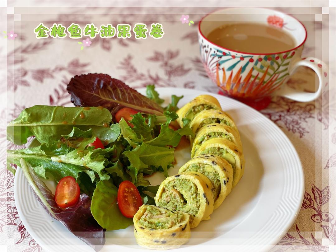 🔺第447道→ 金枪鱼牛油果蛋卷 (以下为2人份) 鸡蛋3个,加盐/黑胡椒粉/黑芝麻打散。 玉子烧锅薄油加热,分次倒入蛋液至凝固成饼,翻面,取出,可做2张蛋饼。 牛油果一个去核挖出果肉,金枪鱼罐头一个,二者混合碾碎,加盐/黑胡椒粉/柠檬汁调味,搅拌均匀,分别平铺在2张蛋饼上,再卷起来切块。 可生食综合蔬菜一把,小番茄几颗对切,淋上沙拉酱。 奶咖一杯。 ⭐️ 金枪鱼罐头也可换成三文鱼