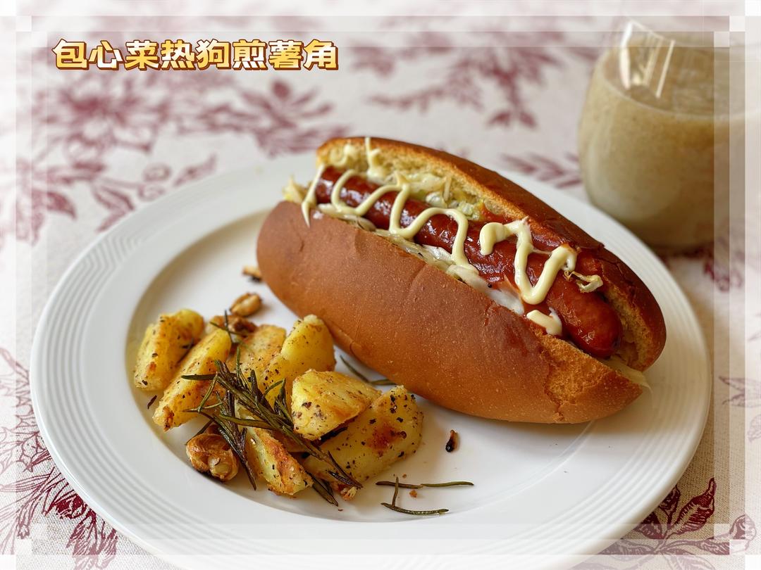 🔺第407道→ 包心菜热狗煎薯角 这是《新手姐妹的双人餐桌》EP03的复刻。 〔酥脆薯角〕土豆煮熟切成角状,沥干水分撒盐/黑胡椒调味,再均匀撒一层面粉裹附在土豆表面。土豆+拍碎的蒜瓣+迷迭香+橄榄油一起放入锅中,中火煎至表面金黄。 〔包心菜热狗〕包菜切丝,热锅热油放入锅中翻炒,加盐/黑胡椒调味。热狗面包从中剖开,先塞入包心菜再放上香肠,根据个人口味喜好挤上番茄酱和黄芥末酱或蛋黄酱。 香蕉半根+猕猴桃1个+水,打成汁。 ⭐️ 这样做出来的薯角酥脆可口,煎得焦焦的蒜瓣和迷迭香也很好吃。