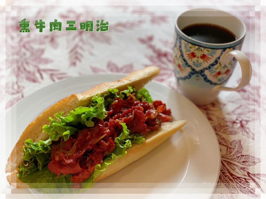 🔺第417道→ 熏牛肉三明治 法棍一段,放入烤箱加热,涂抹一层黄油。 生菜2片洗净擦干水分。 洋葱切丝,热锅热油,放入洋葱翻炒变软,放入熏牛肉(pastrami)翻炒均匀,加少许烤肉酱调味,撒一把芝士碎增稠。 〔组合〕法棍+生菜+洋葱炒熏牛肉 黑咖啡一杯。