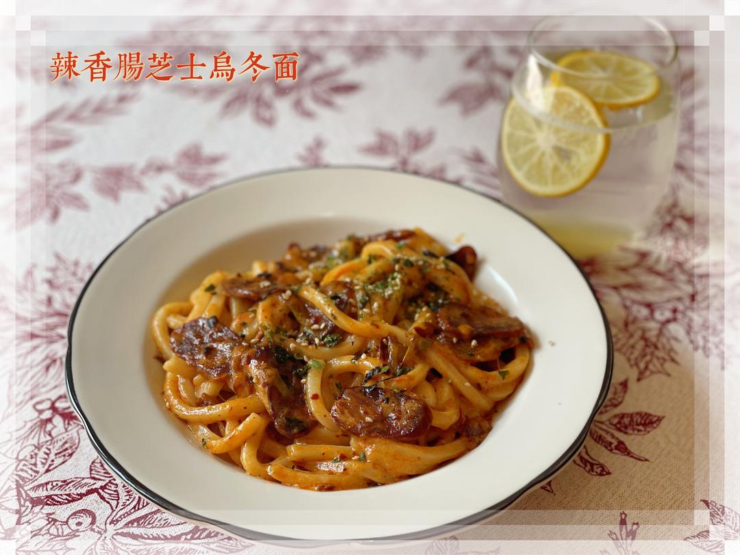🔺第442道→ 辣香肠芝士乌冬面 沸水锅煮乌冬面,约5分钟捞出沥水。 蒜瓣切片,葱白斜向切段,川味辣香肠切片。 热锅热油,放入蒜片和葱段爆香,放入香肠翻炒出香,加入1匙老干妈和1匙油辣子翻炒均匀,倒入适量牛奶转小火煮沸,放入芝士片或芝士碎搅拌均匀至浓稠,放入煮好的乌冬面翻拌均匀吸收汤汁,装盘撒芝麻海苔碎。 柠檬蜂蜜气泡水一杯。