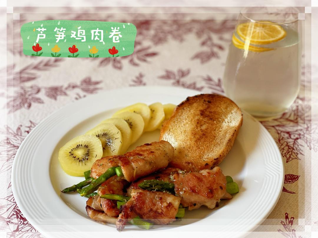 🔺第444道→ 芦笋鸡肉卷 鸡腿肉去骨片成薄片,加姜/蒜末/盐/黑胡椒/小苏打/酱油腌制十分钟。 芦笋切段,用鸡肉包裹,撒层淀粉。 热锅薄油小火,煎至鸡肉表面金黄,盖上锅盖焖1分钟。装盘,撒干香料。 欧包一片,放入锅中加块黄油煎至金黄。 猕猴桃一个切片。 柠檬蜂蜜气泡水一杯。 ⭐️ 鸡腿肉可换成鸡胸肉或培根