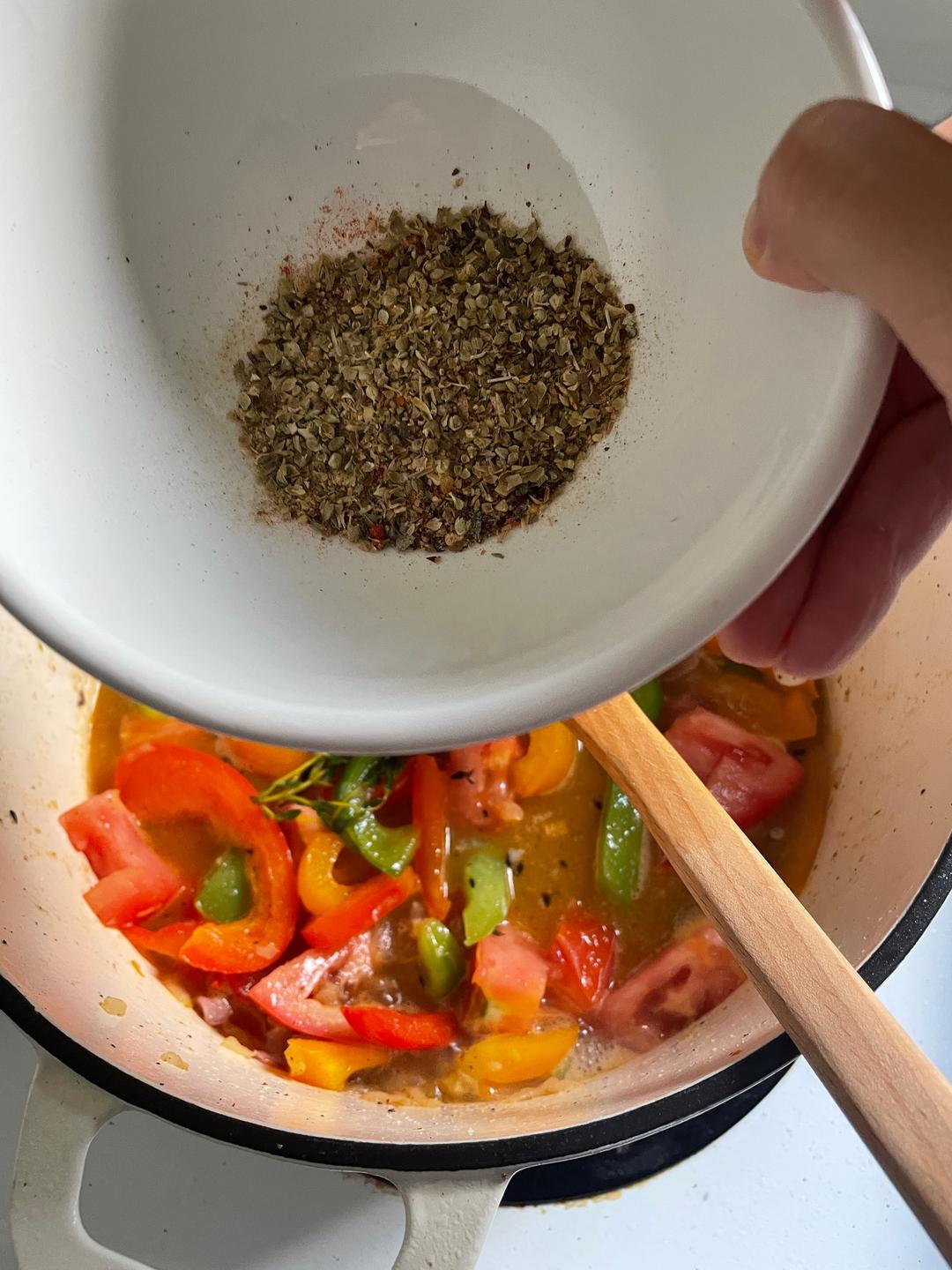 加入各种香料:辣椒片、意大利香料、罗勒、西芹、蒜粉、洋葱粉、盐、胡椒… ((一般来说有什么西式香料都往里面扔就好了¯\_(ツ)_/¯