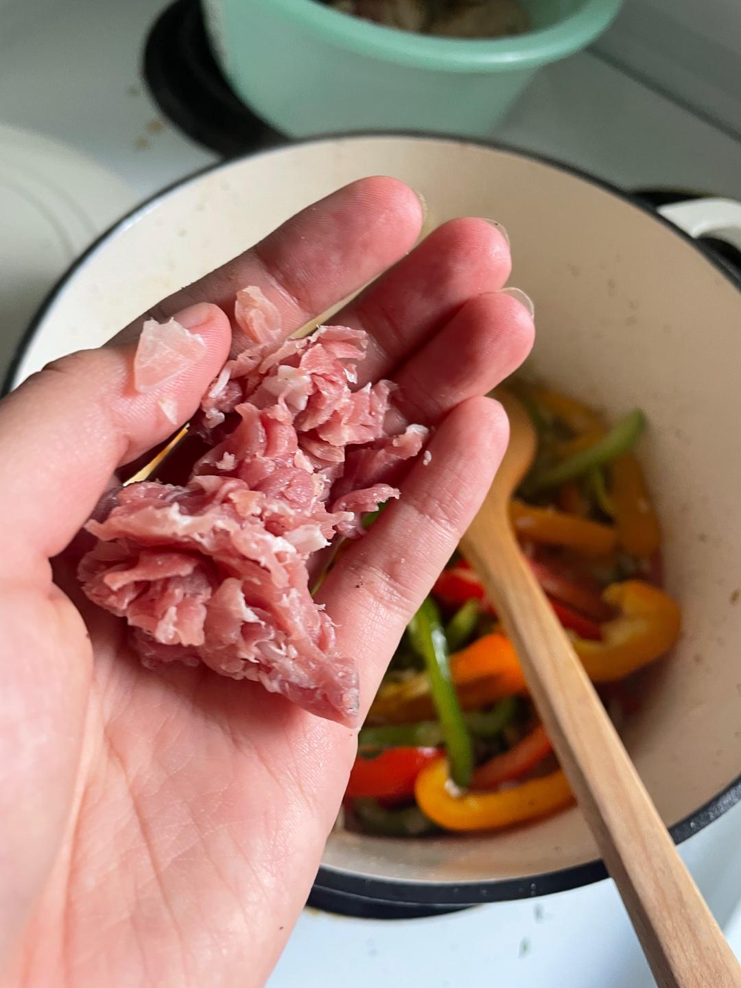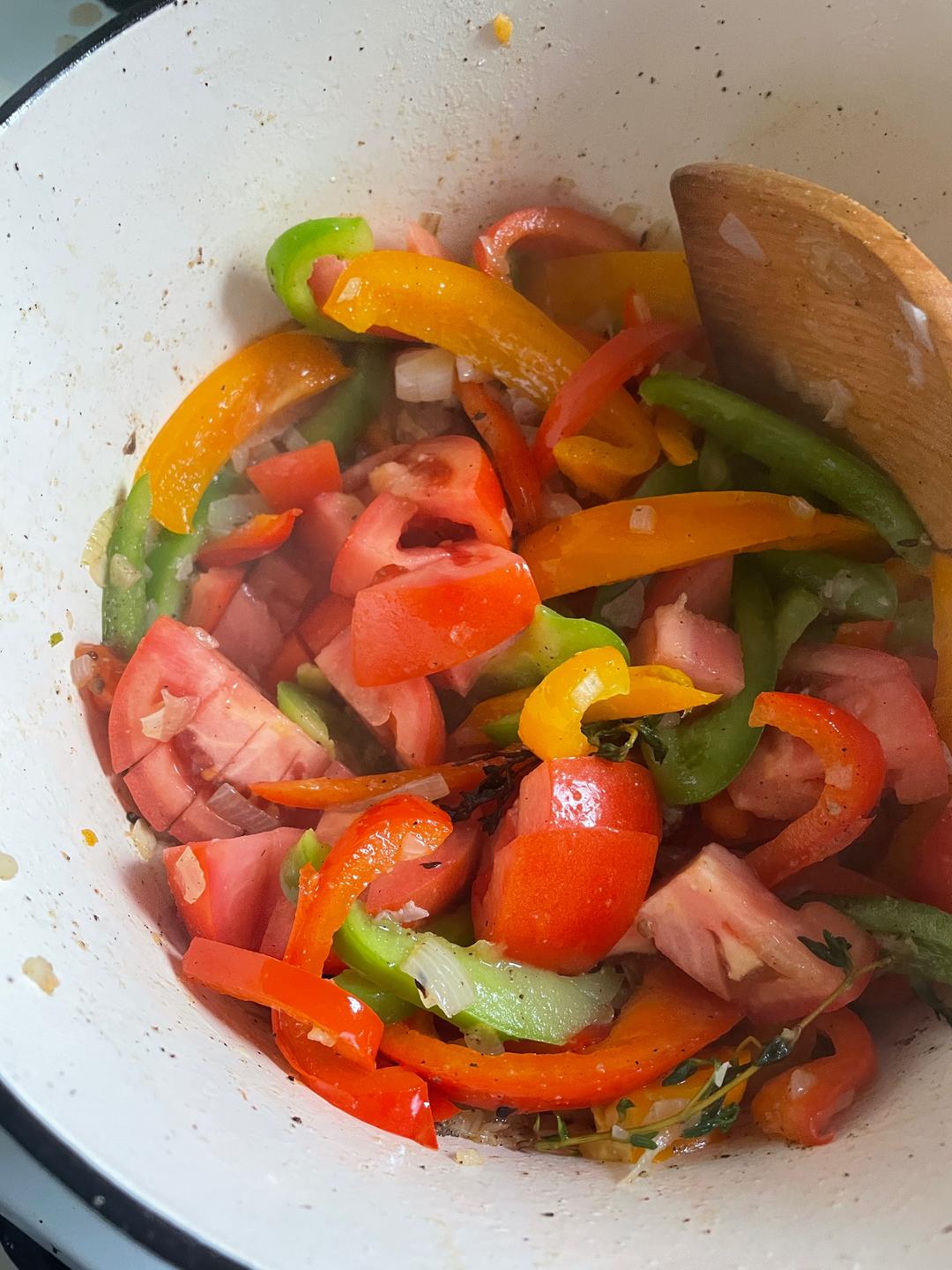 加入切碎的彩椒、胡椒、盐