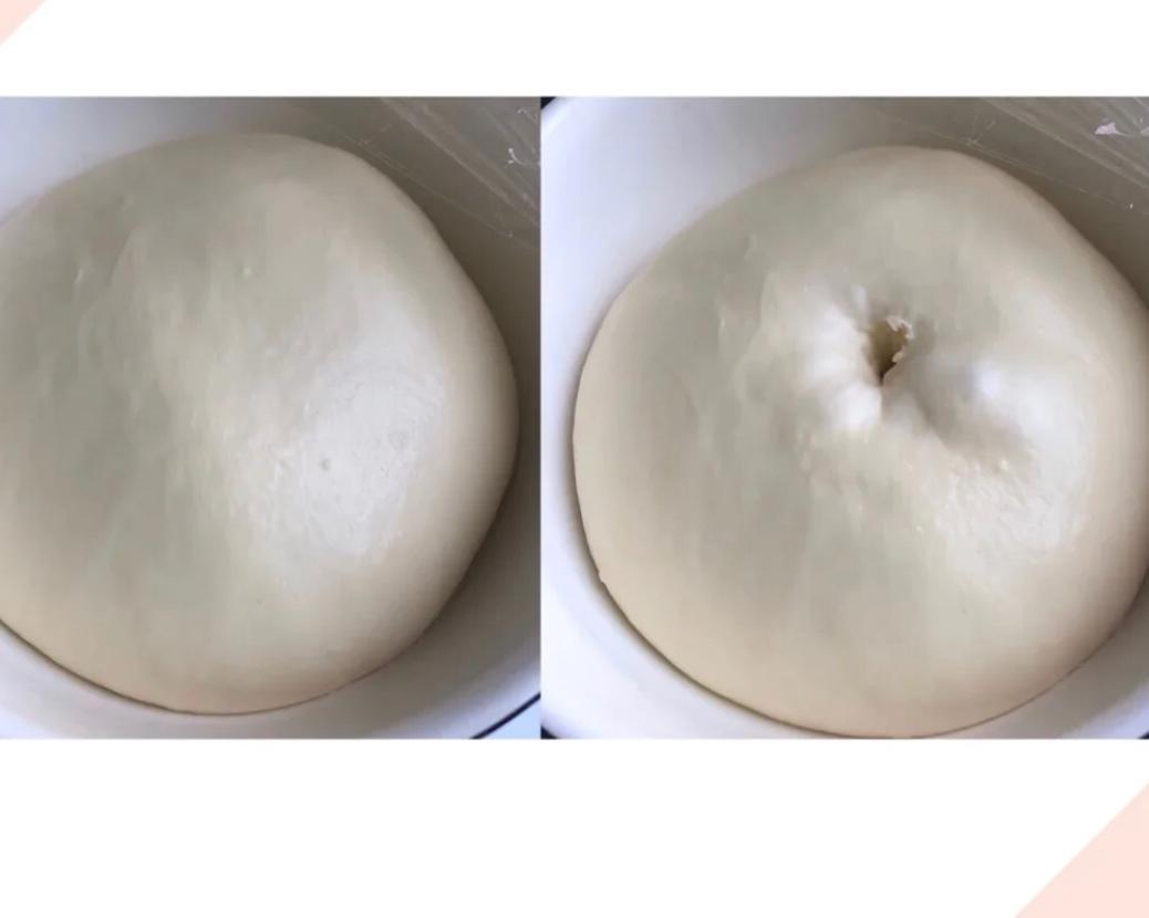 2、面团整形,醒发 ①面团出膜后取出,用手轻轻揉圆,放入盆中盖上保鲜膜发酵至2倍大;室温28度大概60分钟。 ②用手指按压出痕迹不塌陷则说明发酵到位,如果回弹则发酵不足,继续发酵。