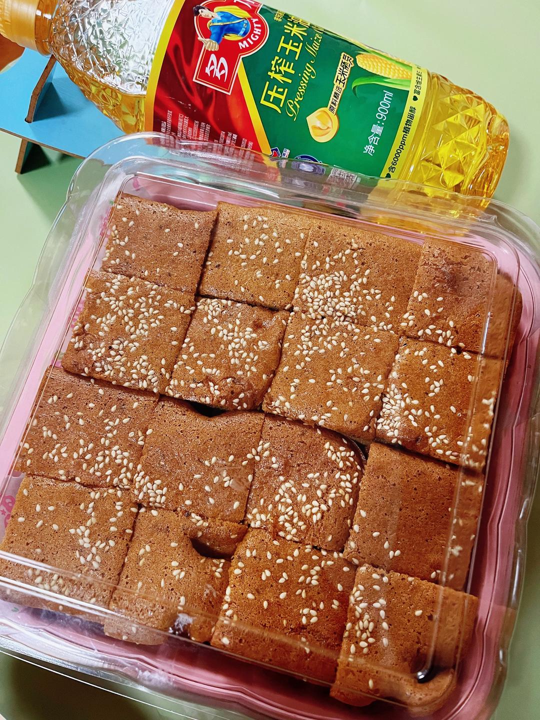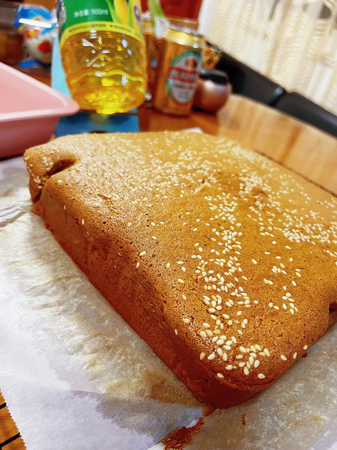 把面糊倒入提前准备好的烤盘(烤盘里垫好油纸,或者直接用不粘烤盘),撒上白芝麻,也可以撒点核桃碎。 同时预热烤箱:上管160度,下管155度,45分钟。 我的这个粉色烤盘不是很厚,如果烤盘厚实的话,建议上下管各+5度,当然最好自己观察下,毕竟自己的烤箱自己懂。