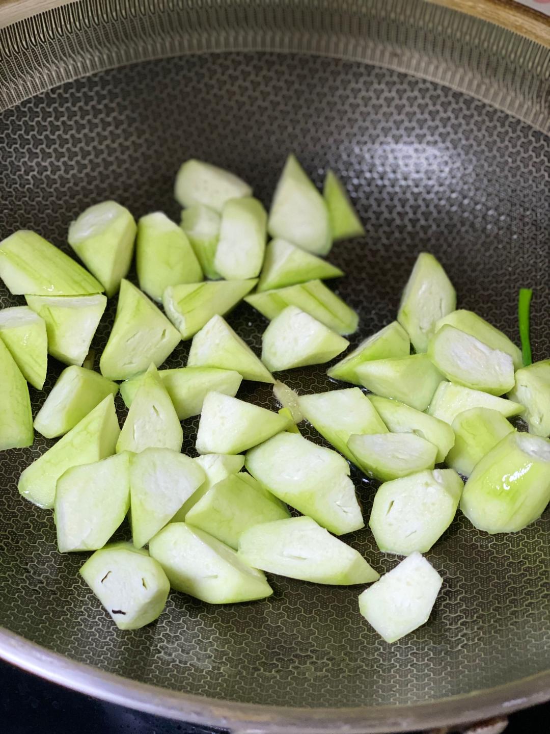 4.倒入丝瓜进行翻炒1分钟。