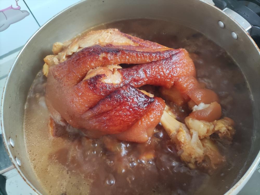 把煎好的肘子,放糖色水里,放老抽,葱,姜,蒜,大料,盐,耗油慢慢炖