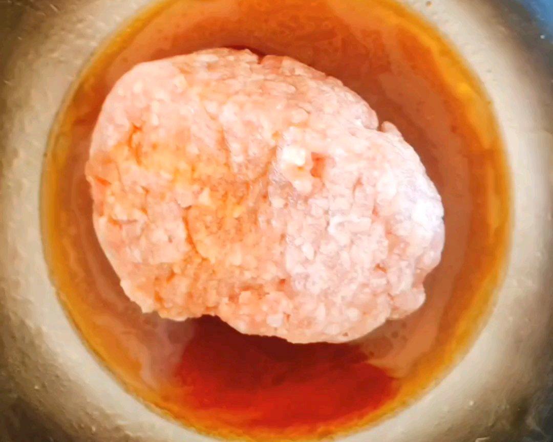 肉沫倒一些黄酒,然后放点油、盐、多一些生抽、一点老抽上色,搅拌,再倒点水搅拌上劲。