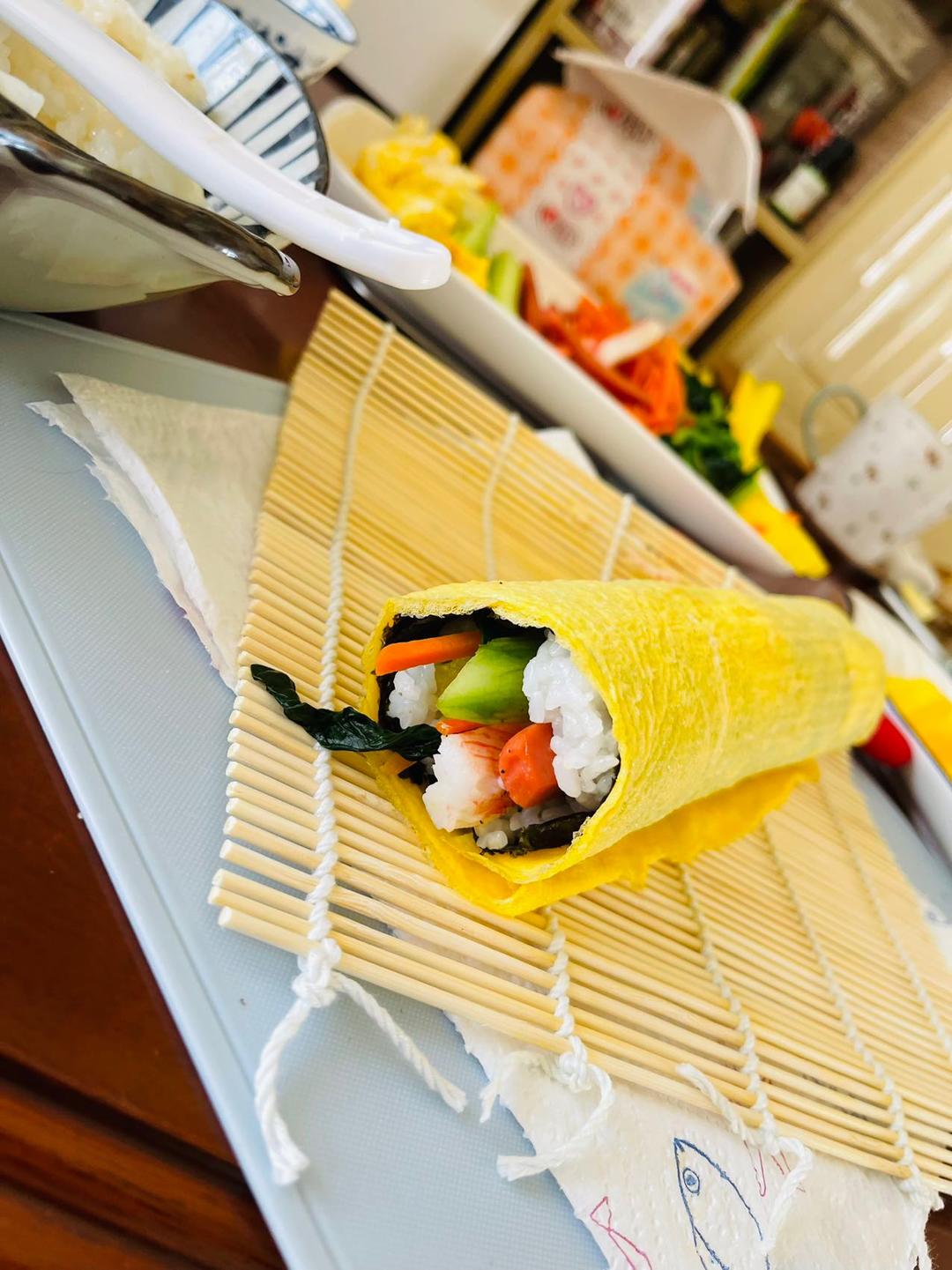 做了两种口味 :1.鸡蛋紫菜包饭(上图)2.金枪鱼紫菜包饭 铺好鸡蛋皮,在铺上一层紫菜:依次摆好米饭 胡萝卜 蟹肉棒 菠菜 黄瓜 火腿肠 鸡蛋丝 黄萝卜条 米饭占紫菜的三分之二 这样卷起来会更饱满些!
