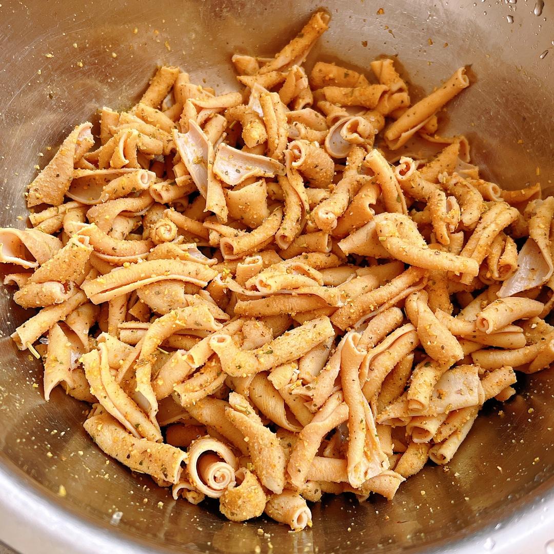 空气炸锅180度,15分钟,中途需要翻拌几次,出锅前喜欢吃辣的朋友可以撒些辣椒粉