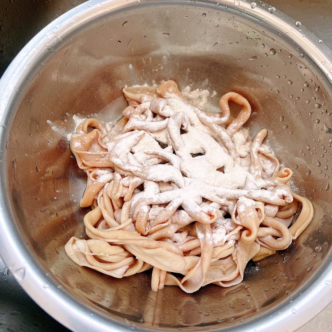 然后再加入两勺面粉抓洗一下,这样可以去除鸭肠的腥味和杂质