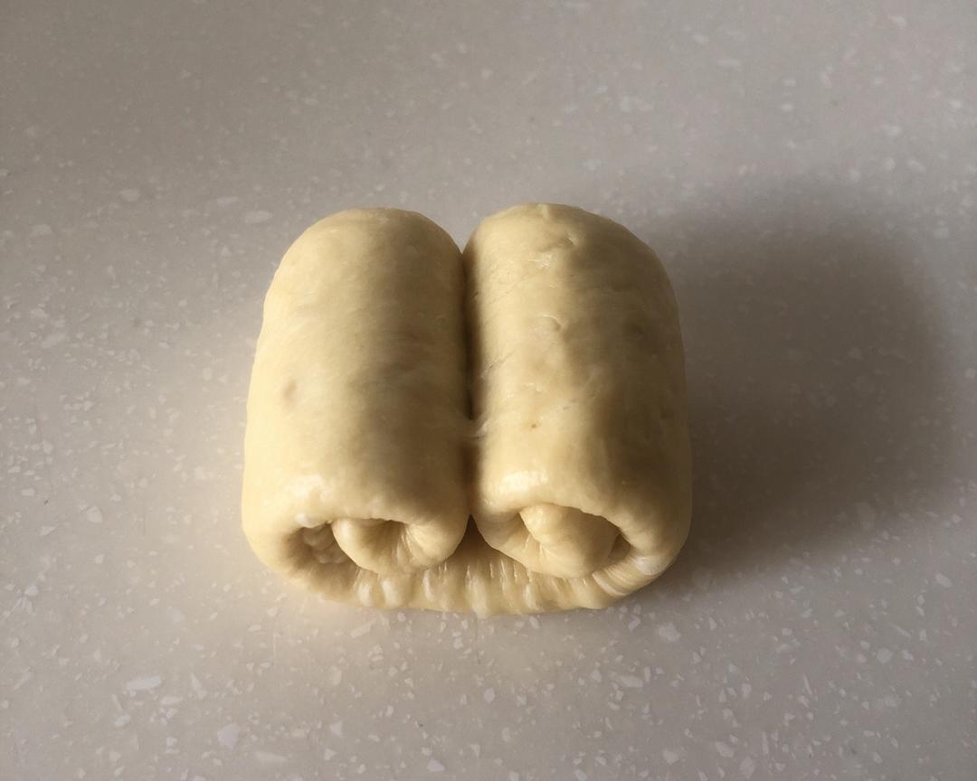 长边各向中间折1/3后,再擀成牛舌形。