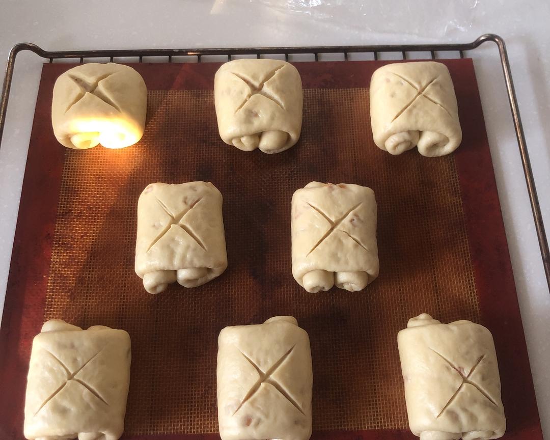 翻过来放入烤盘,用锋利的刀片割口后,再次发酵到两倍大。