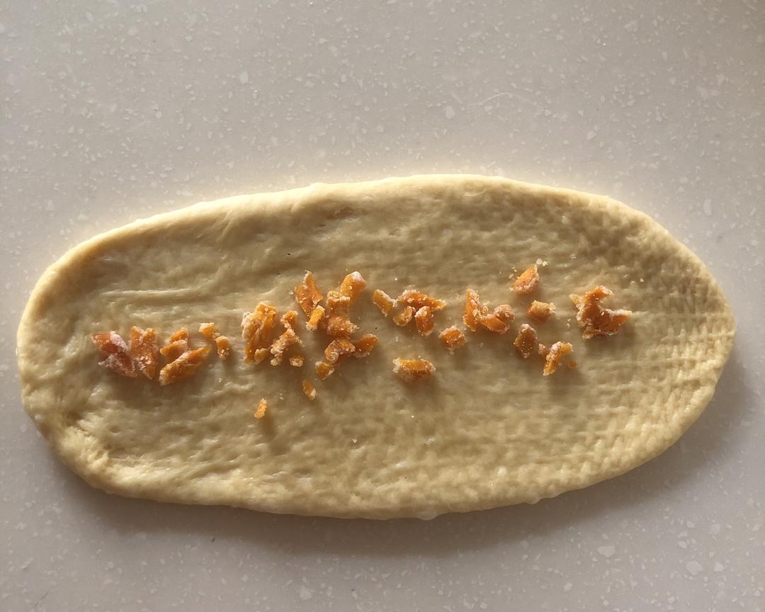先把小面团按扁,擀成长椭圆形,中间撒上芒果丁。