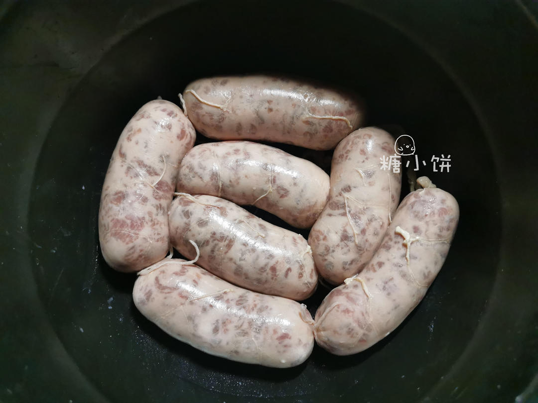将搅好的肉馅灌入肠衣中(肠衣提前泡软,用清水洗净内外)。