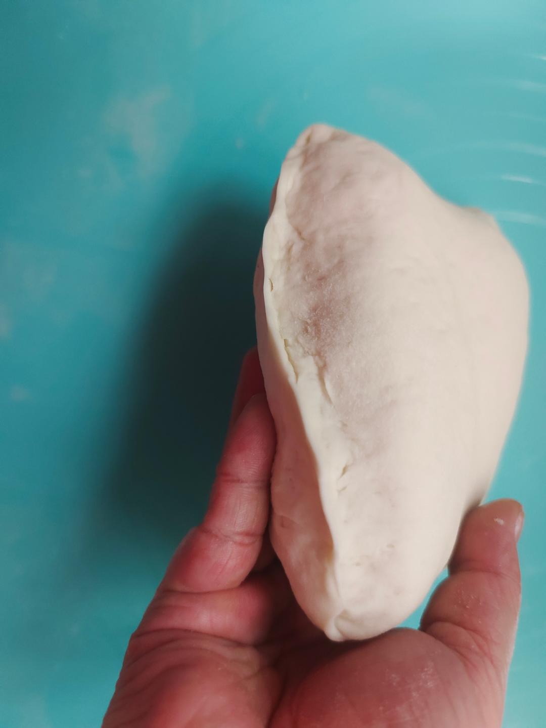 把面粉300克,酵母3克,白糖我放了一勺,不喜欢可以不放,为了促进发酵,温水180克和成一个偏软的面团