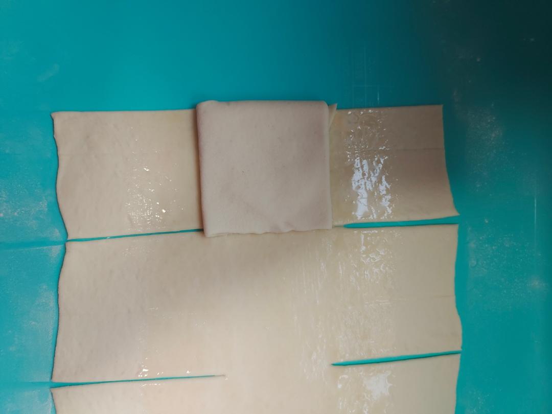 面团醒10分钟,将面团擀开,擀成长方形,大约与上图这么大小。