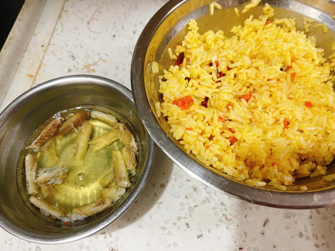 蟹腿肉放蛋清里加点盐,一半蟹黄放蛋黄饭里拌匀。