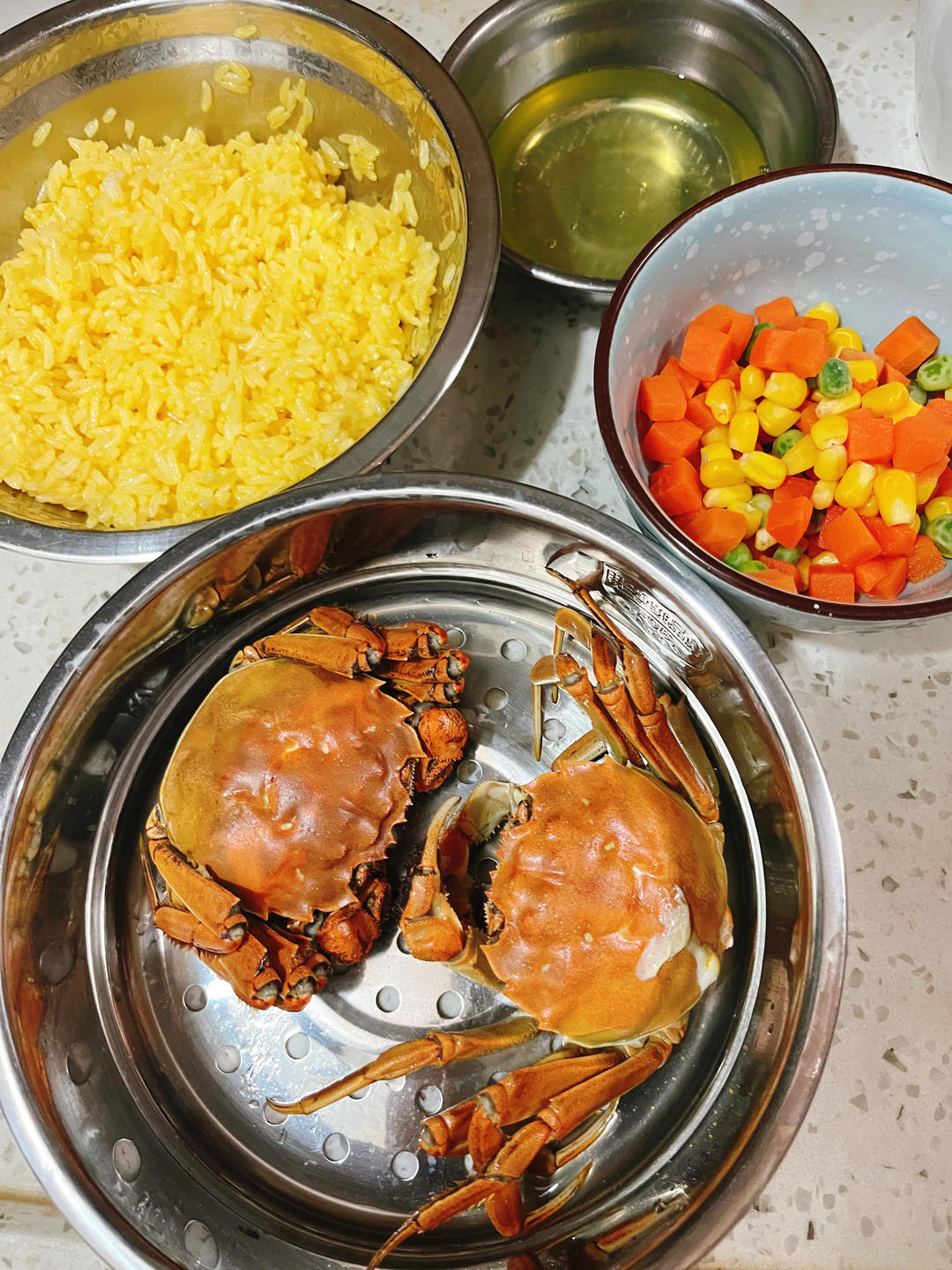 准备阶段: 1、速冻蔬菜粒煮熟备用。 2、大闸蟹水开下锅,大火蒸十二分钟。 3、蛋黄倒入冷饭加点油拌匀,蛋清备用。