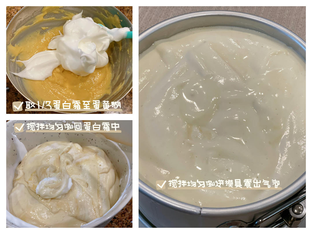 (8) 取1/3的蛋白霜放入蛋黄面糊中,翻拌或切拌的手法迅速搅拌均匀,再倒回2/3的蛋白霜中,同样用翻拌或切拌的手法迅速搅拌均匀,倒入模具中,震出大气泡,放入烤箱。