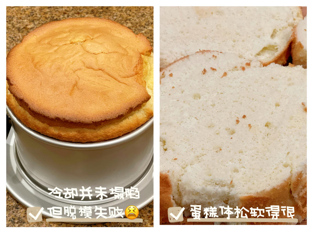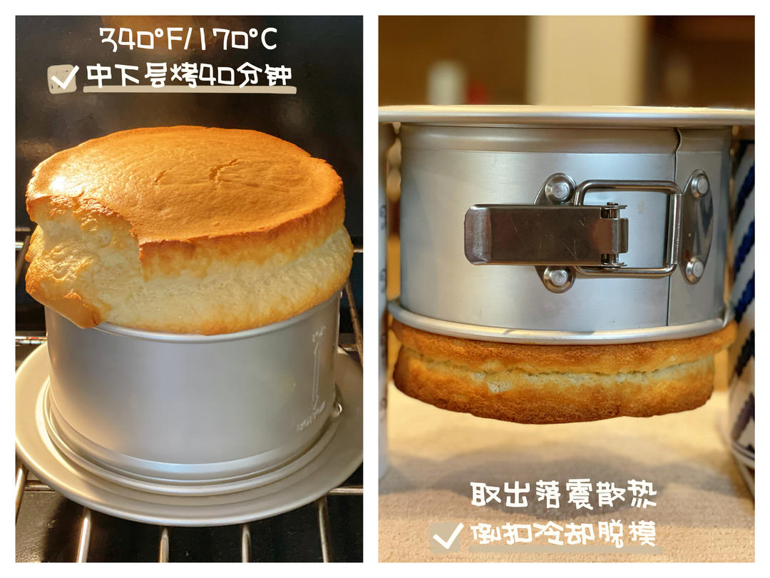 (9) 烤箱340°F/170°C中下层烤40分钟,取出落震散热,立刻倒扣冷却,大概2小时后可以脱模。 ⭐️ 可能是模具不同,也可能是鸡蛋用量多了,烤好的戚风爬了个老高,很是膨胀啊… 不过因为要用来做慕斯蛋糕的夹心,不好看也不重要了,看起来还是蛮好吃的样子。