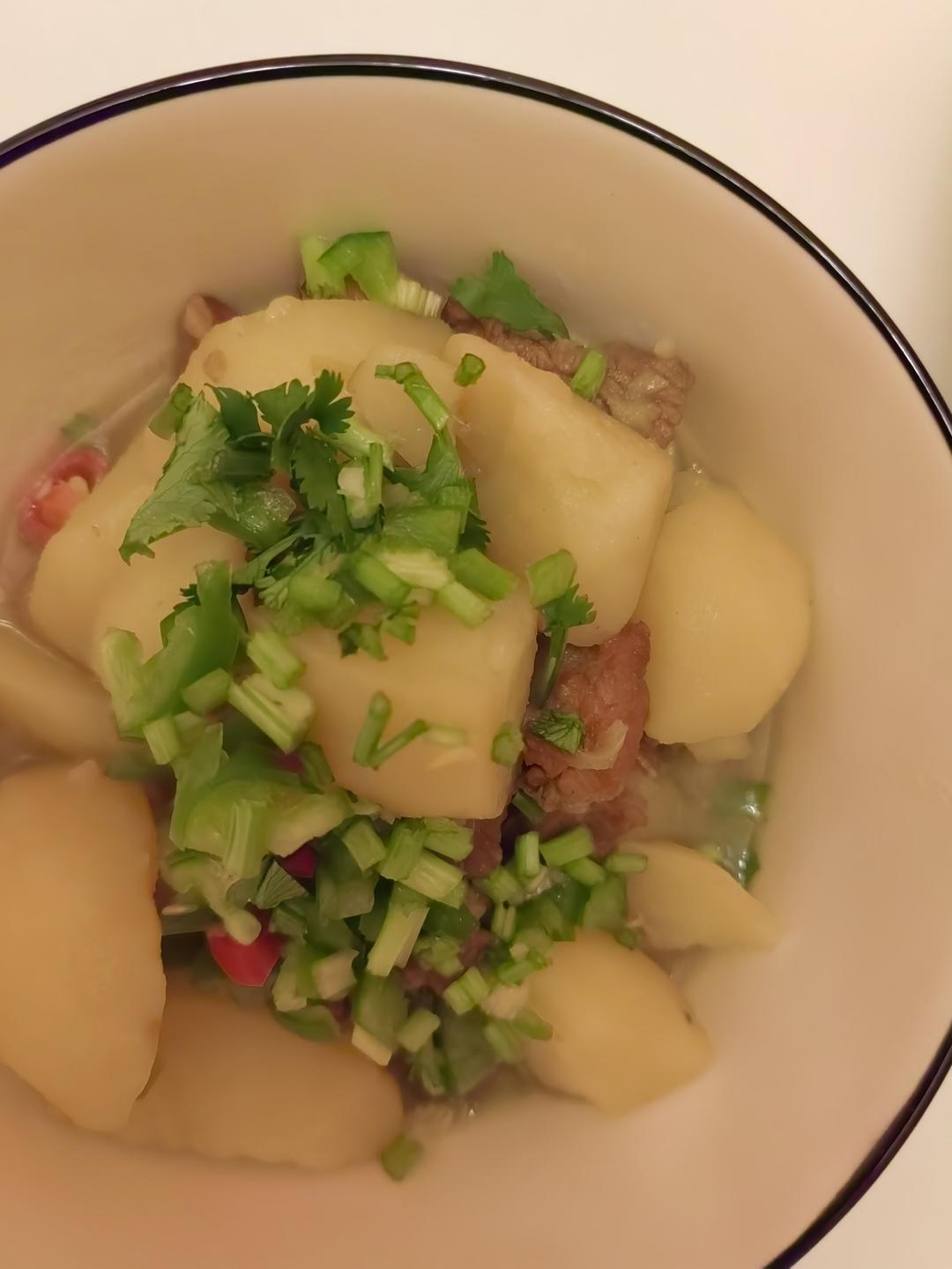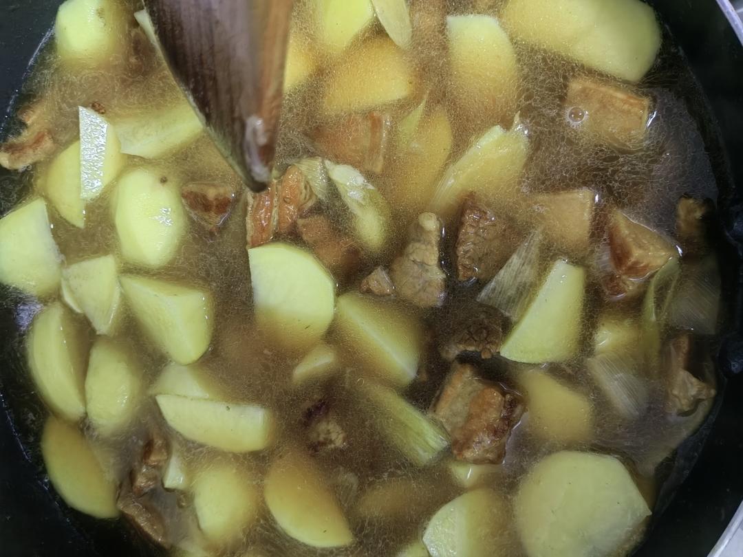 40分钟后加入盐,鸡精,可以尝一下汤汁,咸淡适中后加入土豆,中小火继续慢炖15分钟