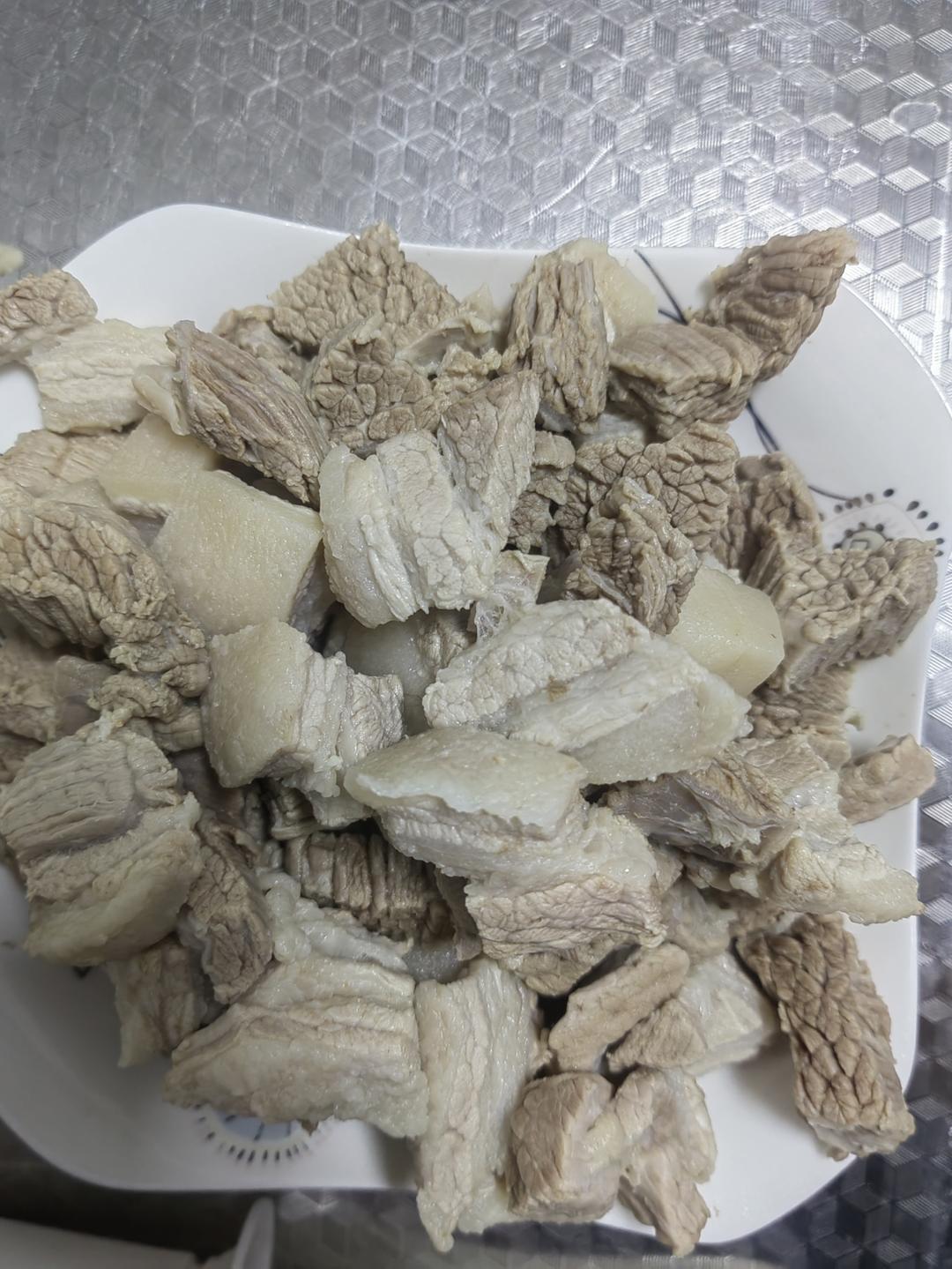 五花,牛肉分别洗净切成小块,凉水下锅,倒入适量料酒(去腥),放入两片姜,两大段葱段,开锅后,捞出,用凉水洗干净