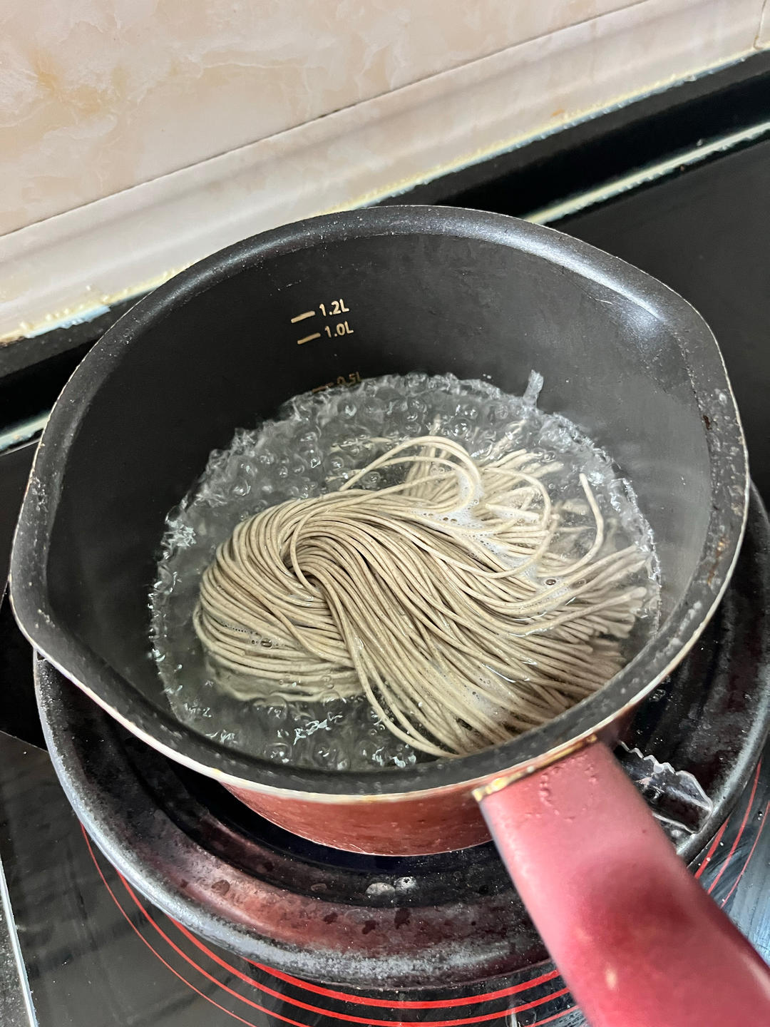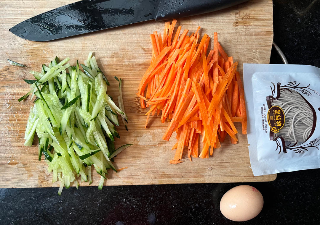 先备菜,把胡萝卜和黄瓜都切丝,面条我用的半干荞麦面