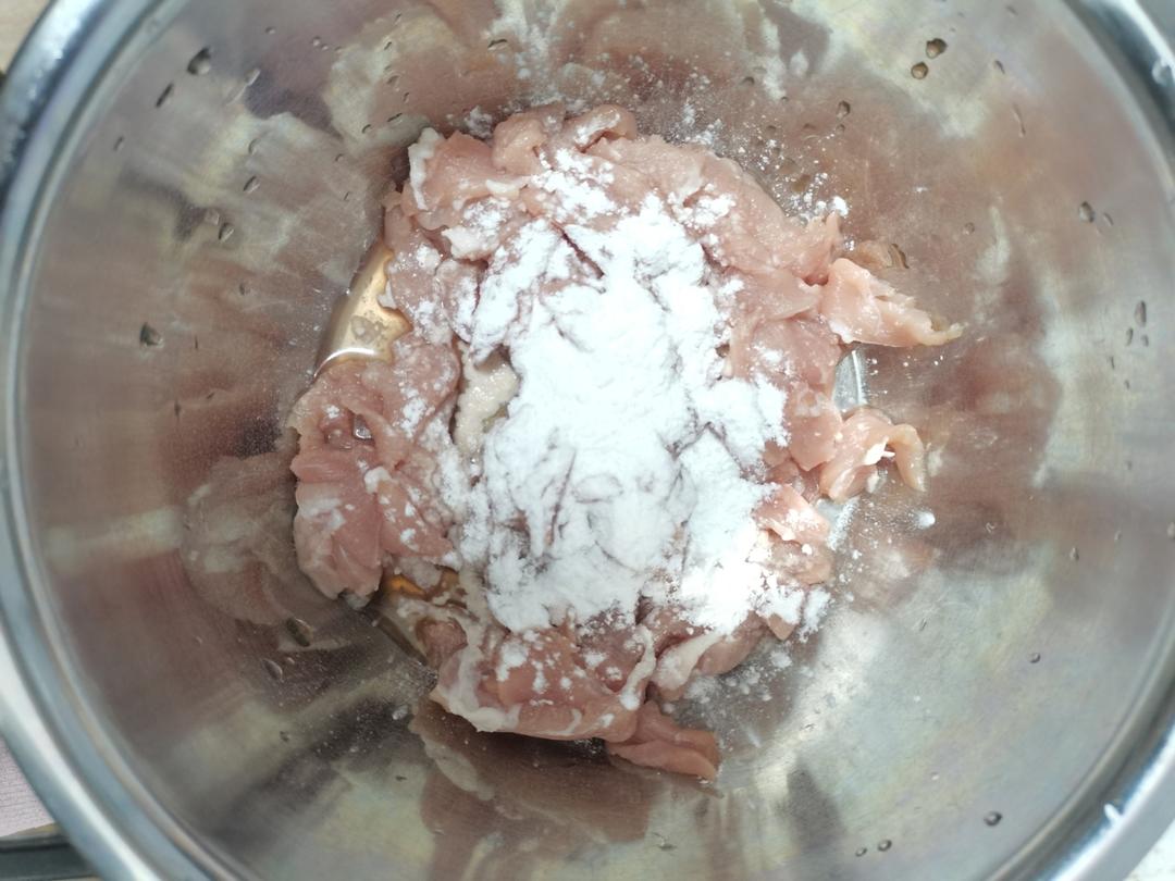 肉切薄片加入一勺料酒、一勺水和水煮肉片调料包里面的腌肉料腌制一会。(大概10—15分左右😁)