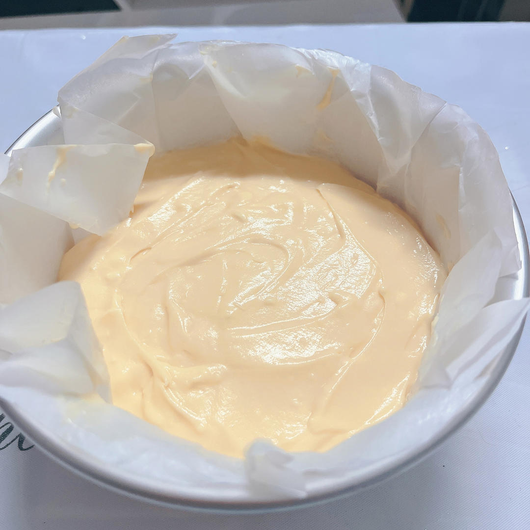 芝士糊过筛后倒入铺好油纸的模具里,刮刀刮平,震出气泡。