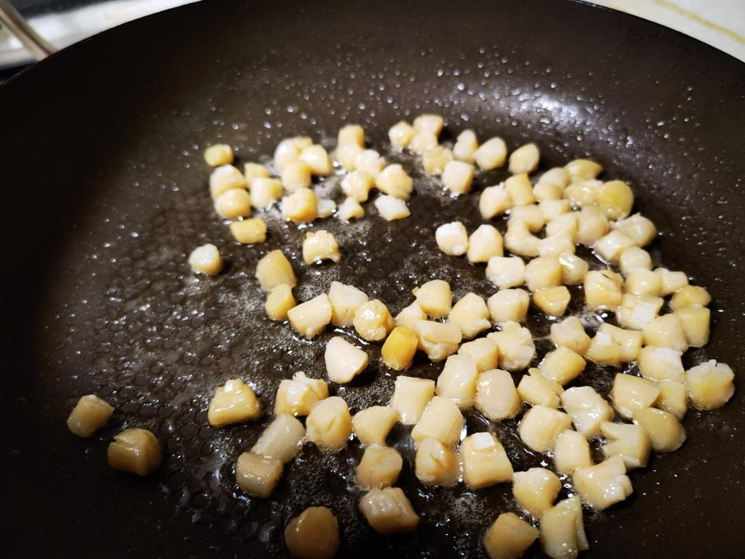 瑶柱沥干水,锅里加油爆一下捞出备用。虾米也同样操作。