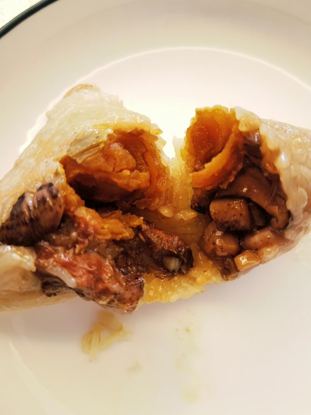 将叶子卷起后,依次放入花生糯米、瑶柱三颗、虾米两三个、香菇三四片、萝卜干若干,接着放肉和咸蛋黄,最后再加上糯米花生,压平,覆上粽叶包好,用绳子绑紧。长出来的叶子尾端用剪刀剪去会更美观