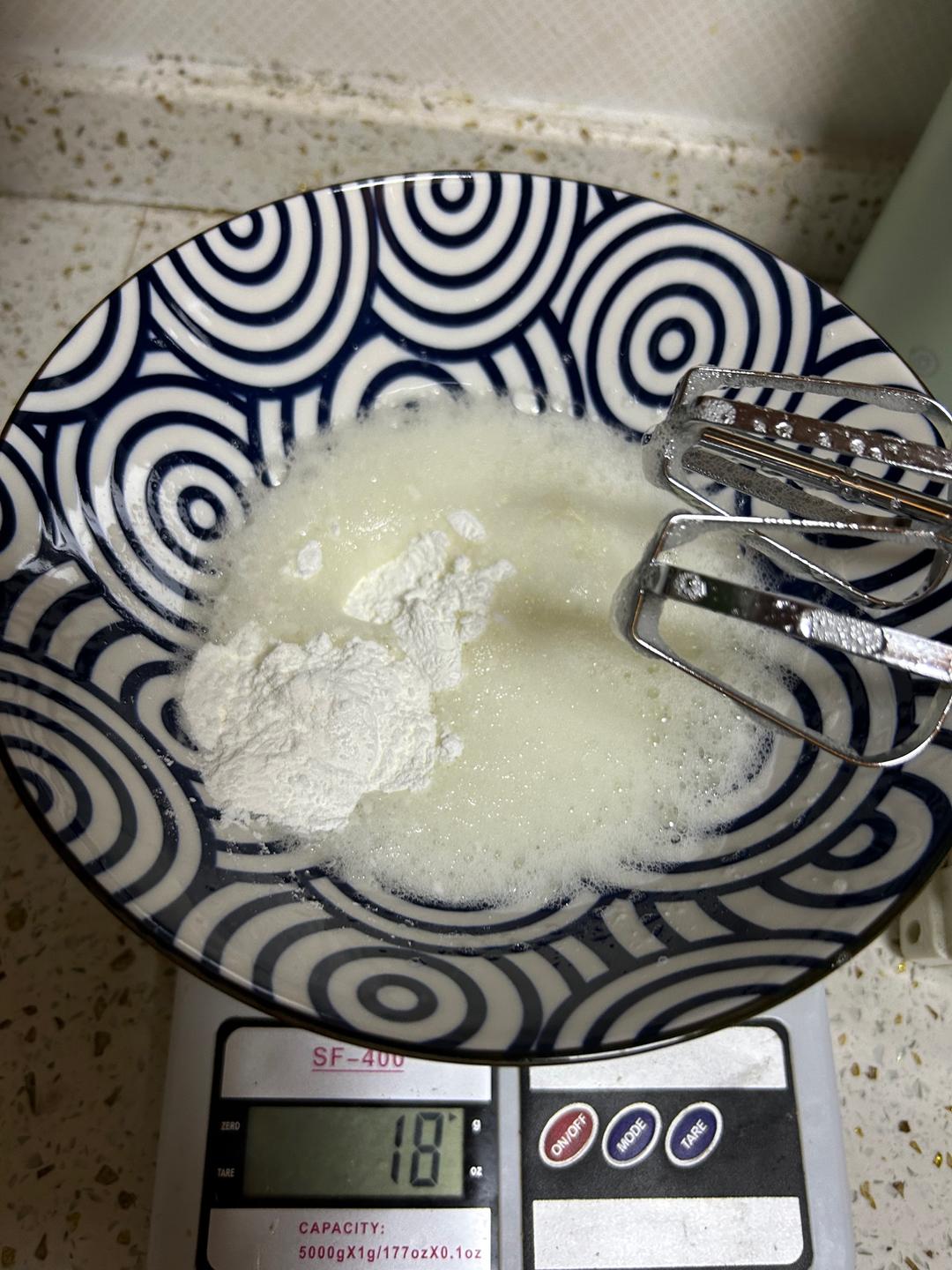 三个蛋白,加柠檬汁打发(这个时候可以预热烤箱了,110度,90分钟,没看错就是需要这么长时间,具体实际时长还得根据自家烤箱,如果没烤酥脆就继续,我开了风炉)