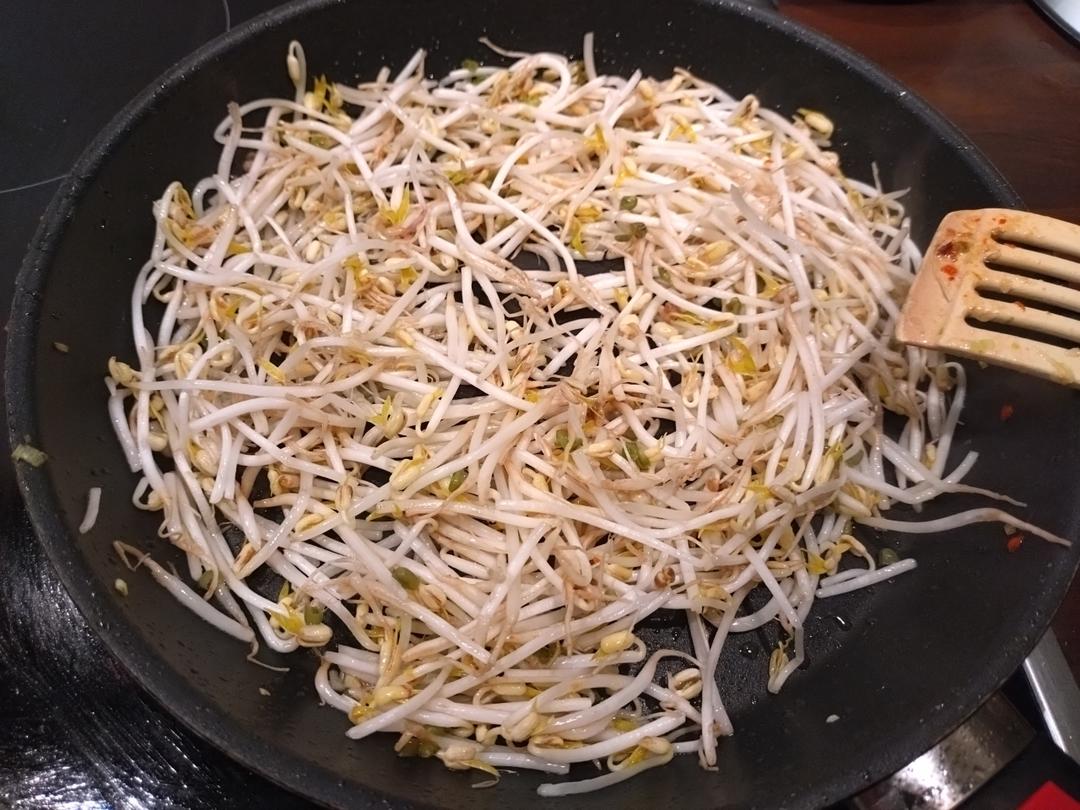 食谱原本不用豆芽,但是这次家里还有,而且吃蔬菜对身体好,所以我一起放了进去煎一下。