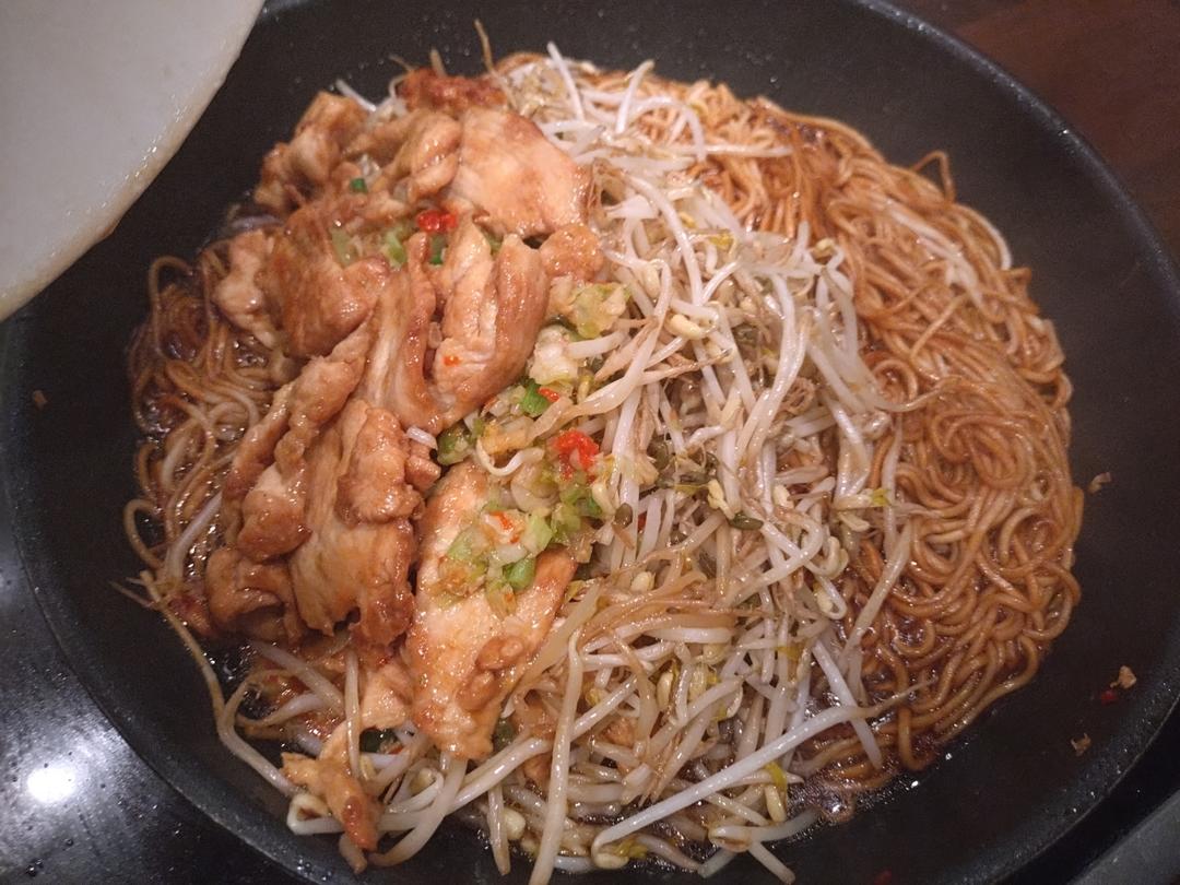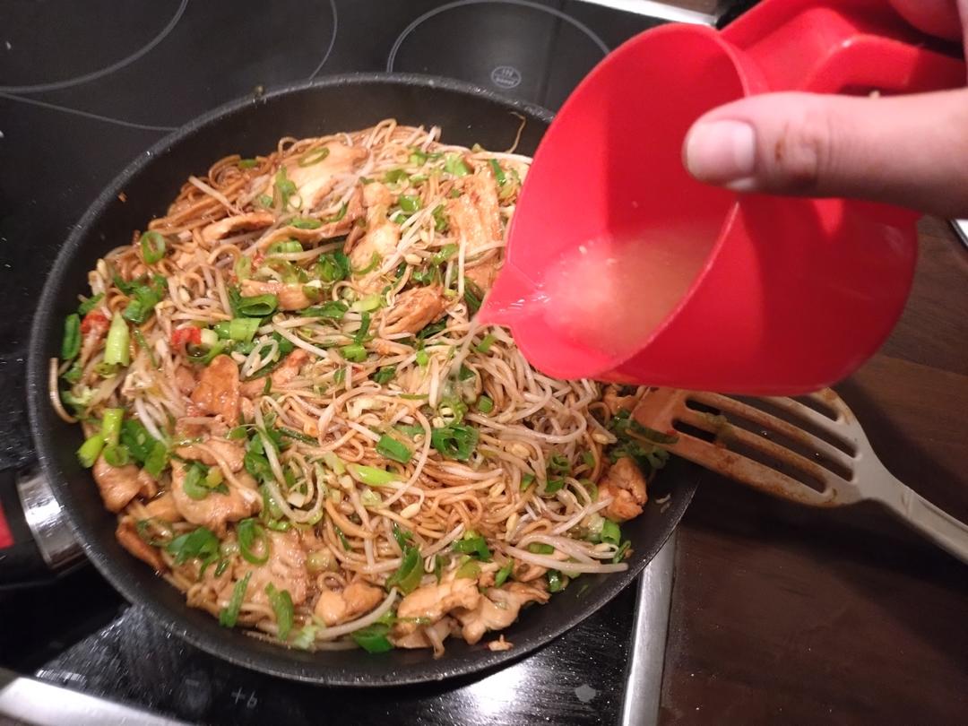 不要煎太久,要不然豆芽菜会烂掉。放一些生抽与开水,备用。