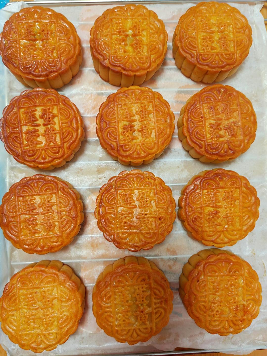 一定要用新鲜的咸蛋黄,准备49个咸蛋,把咸蛋黄从咸蛋里敲出来,用水龙头冲洗掉蛋白膜,放入垫好油纸的烤盘里摆放整齐,喷点白酒去腥,放入烤箱不用预热,150度烤10分钟,烤到蛋黄上有细小的油珠冒出即可,然后拿出来晾凉,再用玉米油浸泡盖上保鲜膜放入冰箱冷藏一个晚上再拿出来用!(详细步骤在后面的方子会发)