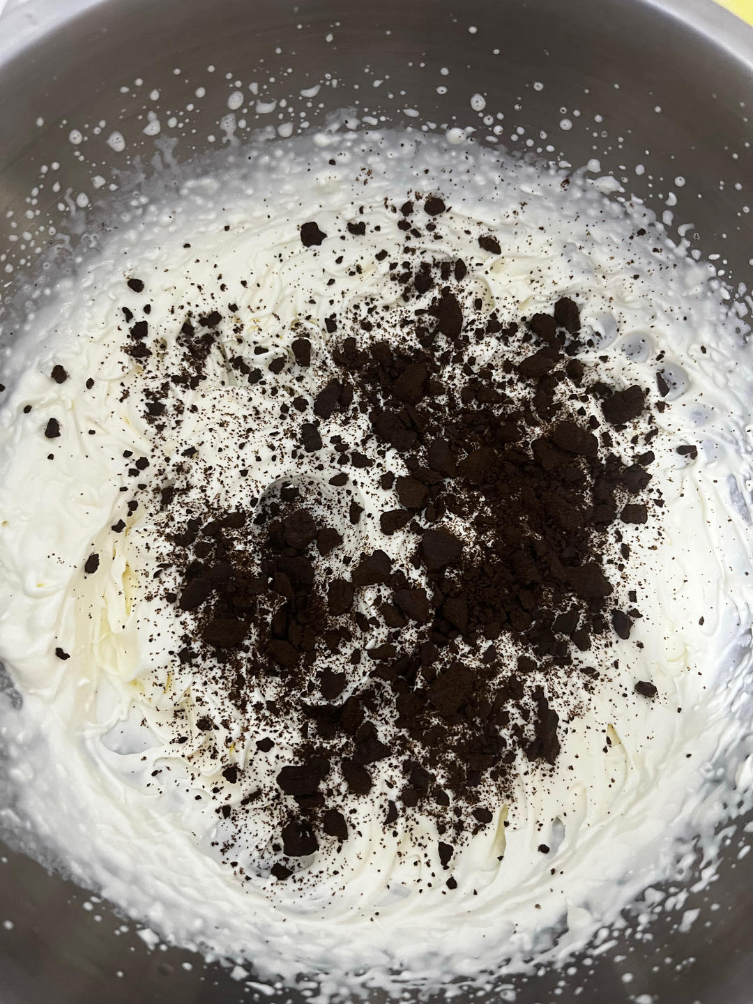 180g的奶油加入18g糖,用打蛋器打发至倒置盘奶油不会掉下来即可,可以加入喜欢的饼干或巧克力之类也可以不加