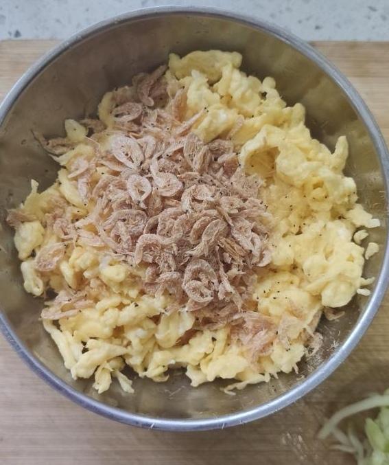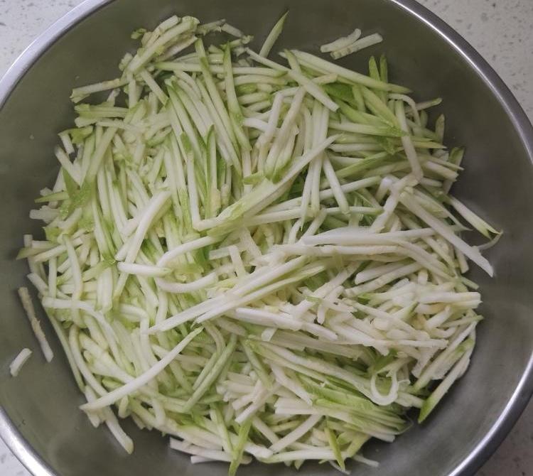 馅:西葫芦擦丝简单剁碎,撒0.5g盐,挤水,鸡蛋碎,虾皮瑶柱用水泡去盐,木耳泡发