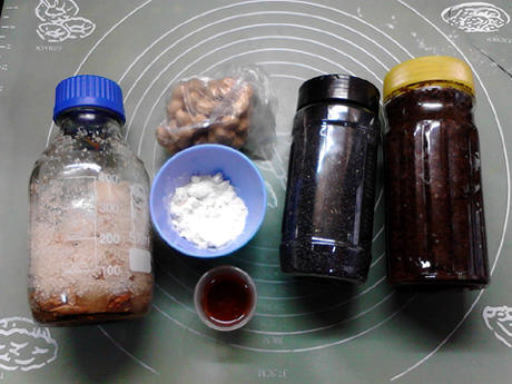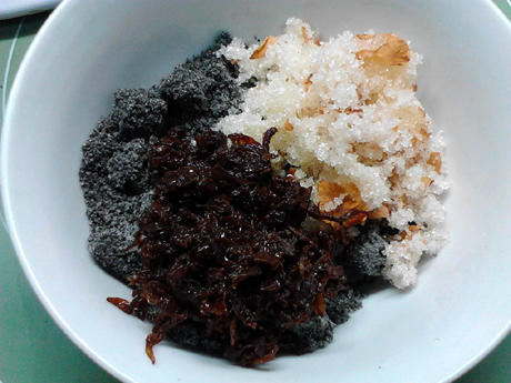 用料:熟黑芝麻55克,熟花生仁10克,玫瑰糖110克,糖玫瑰30克,芝麻油15克,熟面粉10克。