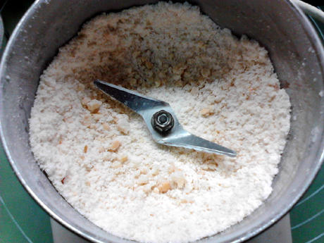 把熟面粉和花生仁一起放入料理机磨粉杯中,