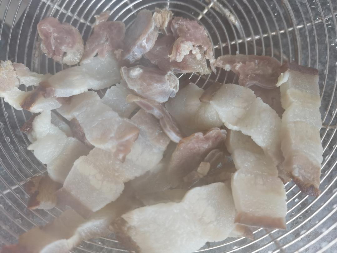 冷水放腊肉煮开3分钟淖水,冷水冲凉,再切片,重复淖水2次(去腊肉咸味)。
