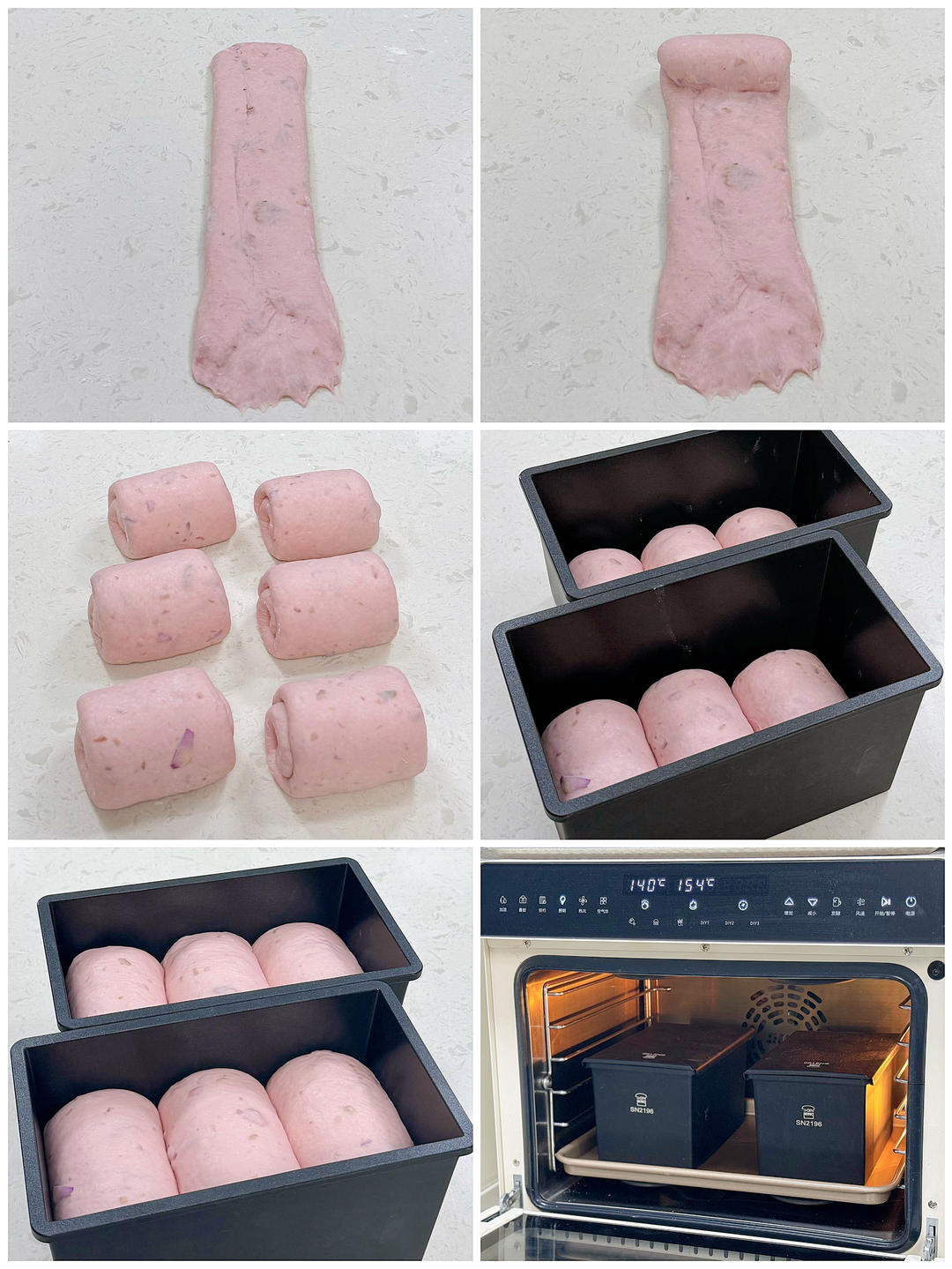 5⃣️面团再稍稍擀长,卷起,3个为一组放入吐司模具中,32-35度,二次发酵至8分满