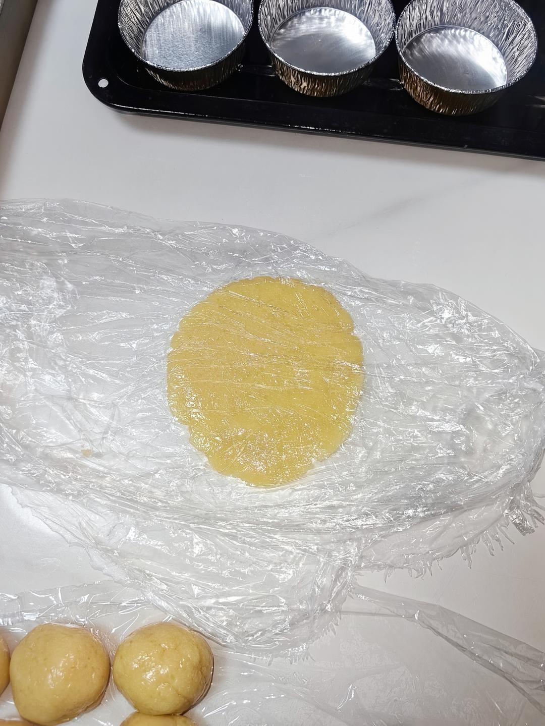放入模具中,稍微压实周边。 ⚠️没有模具可以在烤盘垫上油纸,用手把面团压扁即可。